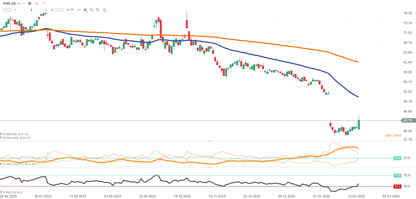 En gráfico diario, PYPL.US mantiene una estructura bajista definida, con una secuencia de máximos y mínimos descendentes y cotización sostenida por debajo de la EMA 50 (azul) y la EMA 200 (roja), ambas con pendiente negativa. La EMA 50 actúa como resistencia dinámica de corto plazo, mientras la separación respecto a la EMA 200 refleja la consolidación del deterioro técnico en el medio plazo.