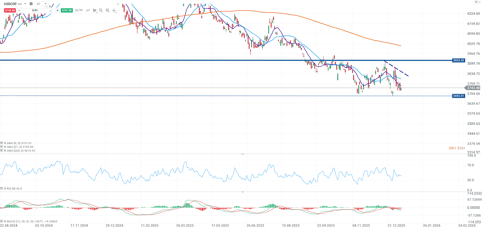 En el plano técnico, el USDCOP sigue mostrando estabilidad dentro del rango que se ha formado desde noviembre de 2025. El par se mantiene por debajo de sus medias móviles de corto y largo plazo, lo que, por ahora, es consistente con una postura relativamente favorable para el peso colombiano. Aun así, la zona de 3.692 se mantiene como el soporte de referencia y, en el corto plazo, el dólar podría seguir mostrando una fase de estabilización dentro del rango, con movimientos sensibles a la evolución del dólar global y a cómo el mercado termine de digerir el set de datos de EE. UU.