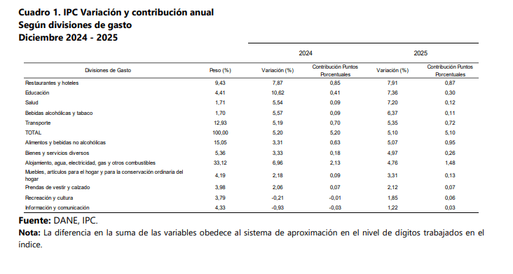 Dentro del detalle de 2025, las divisiones del gasto con mayor variación fueron restaurantes y hoteles (7,91%), seguida por educación (7,36%), salud (7,2%), bebidas alcohólicas y tabaco (6,37%) y transporte (5,35%).