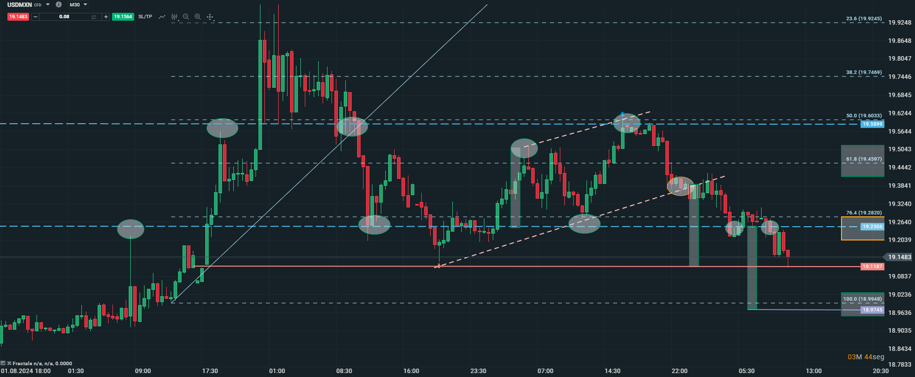 Si el precio rompe los 19.1187 el precio podría extender ese impulso bajista hacia los 18.9745, en el caso contrario podría volver hacia los 19.2506.