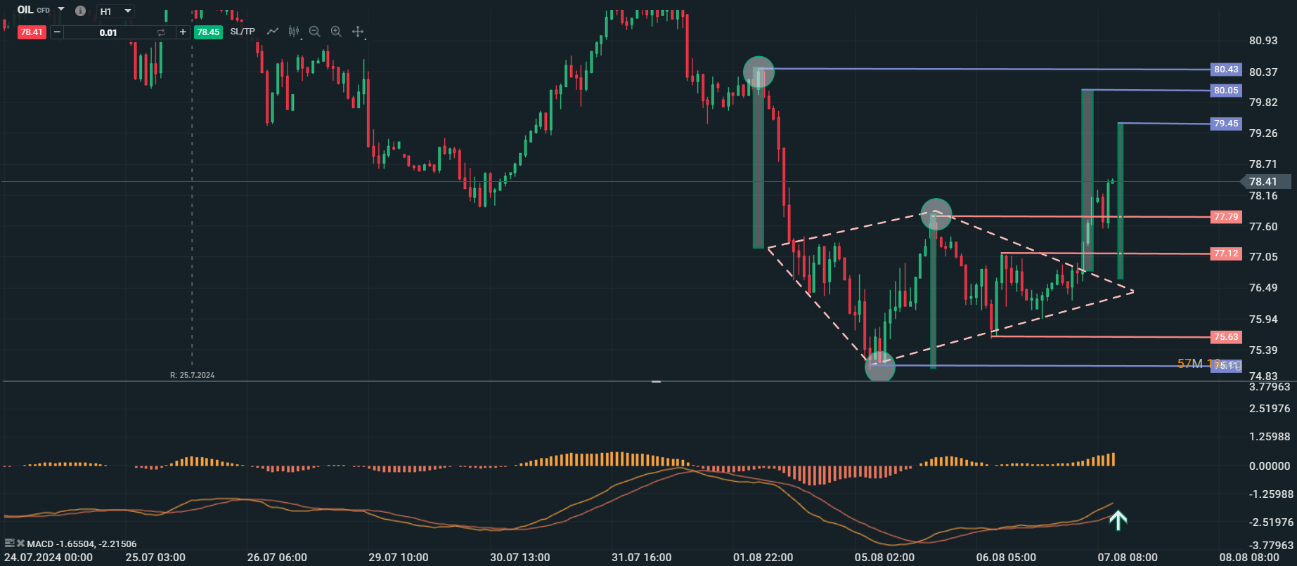 Esto provocó un pequeño cambio en la estructura bajista y estableció objetivos del día en $79.49 y $80.05, con un soporte clave en $77.12. Si el impulso no se mantiene, el precio podría retroceder a $75.63. Fuente: xStation 5
