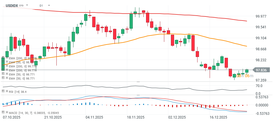 El PMI de Chicago de Estados Unidos para diciembre se ubicó en 43,5, superando las expectativas de 40 y el registro previo de 36,3. El dólar estadounidense muestra una leve apreciación en la jornada, aunque su reacción al dato mejor de lo previsto desde la región de Chicago se mantiene contenida.