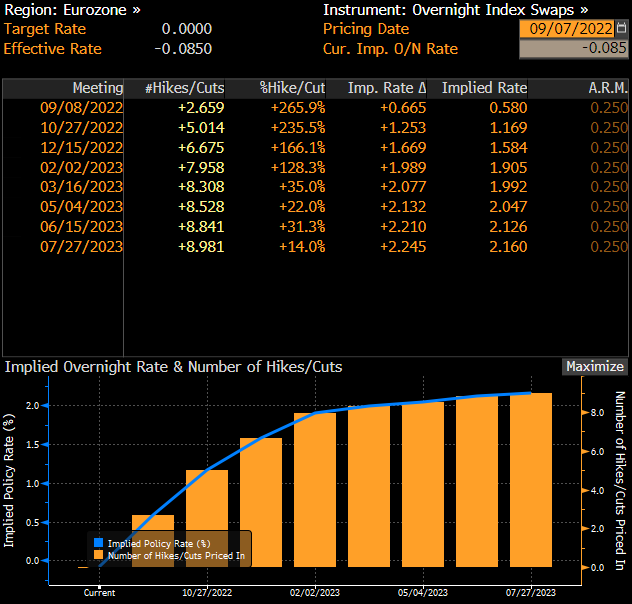 La mayoría de los economistas encuestados por Bloomberg esperan que el Banco Central Europeo realice un aumento de los tipos de 75 puntos básicos en una reunión el jueves, colocando la tasa de la facilidad de depósito del BCE en 0,75%. Los mercados monetarios también están avanzando poco a poco hacia ese resultado con 66 puntos básicos de ajuste actualmente descontados.