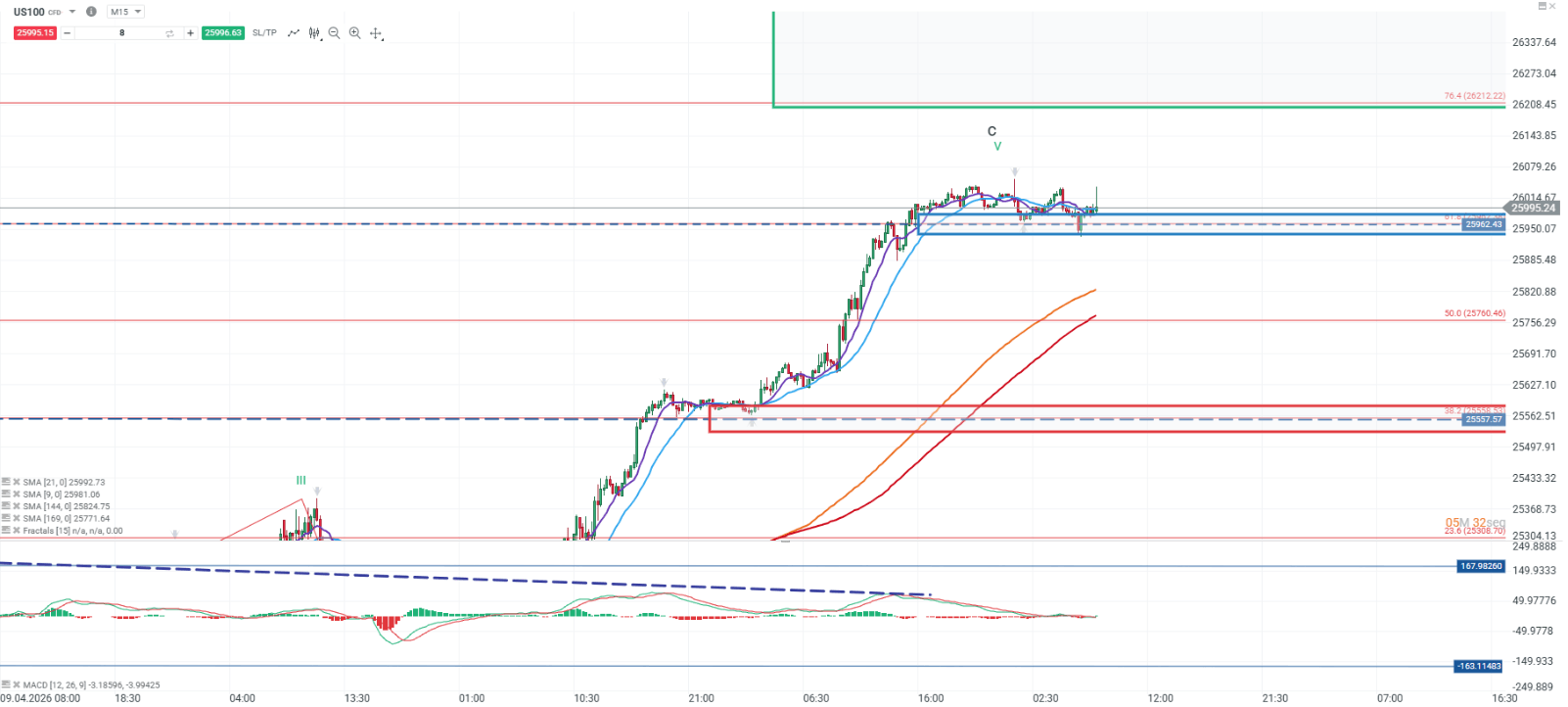 Mientras el soporte de los 25.962 puntos continúe siendo respetado, el movimiento alcista podría extenderse hacia la zona de los 26.112 puntos, en línea con la proyección de la extensión del impulso previo. En cambio, una pérdida de este nivel podría dar paso a un movimiento correctivo, con una primera referencia de apoyo en la media móvil de corto plazo y un soporte más relevante en torno a los 25.557 puntos.