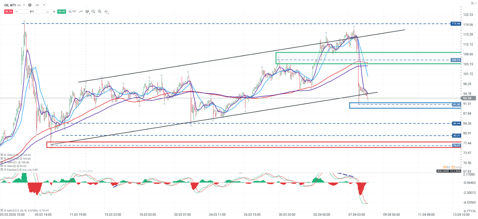 Tras la confirmación de un alto al fuego de dos semanas, el precio del petróleo ha experimentado una reversión significativa. Previamente, se había identificado la zona de 119,48 como una resistencia clave, acompañada de señales de agotamiento en el indicador MACD. A partir de ese nivel, el precio desarrolló un movimiento bajista que lo llevó a testear el soporte en torno a los 91,08, zona que además coincide con la parte inferior del canal técnico previamente trazado, reforzando su relevancia.