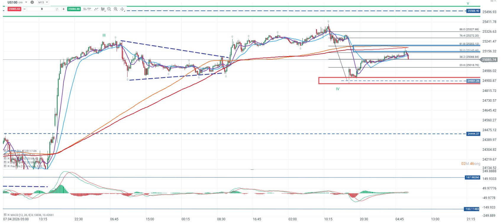 Este nivel se presenta como una resistencia clave. Una superación clara podría habilitar una extensión alcista hacia la siguiente resistencia relevante, situada en torno a los 25.500 puntos. En cambio, si el precio no logra romper esta zona, podría reanudarse el movimiento bajista, con el soporte principal nuevamente en los mínimos de apertura, cerca de los 24.900 puntos.
