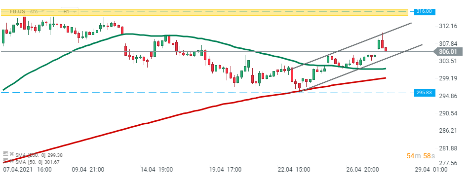 Las acciones de Facebook (FB.US) rebotaron en el límite superior del canal ascendente y borraron las ganancias de hoy; sin embargo, en el caso de resultados trimestrales sólidos, es posible un movimiento ascendente hacia el máximo histórico de 316 dólares. Por otro lado, si los resultados resultan decepcionantes, entonces el soporte más cercano se encuentra en $ 295,83. Fuente: xStatnion5