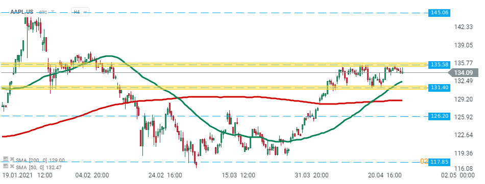 Apple (AAPL.US) ha estado operando en un movimiento lateral recientemente. Quizás la publicación de los resultados trimestrales de hoy dé lugar a movimientos de precios más importantes. Fuente: xStation5