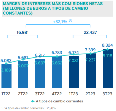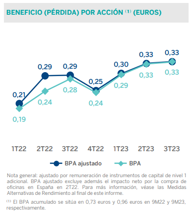 Estas cifras son muy buenas, aunque si observamos sus resultados del tercer trimestre del 2023 con respecto al tercer trimestre de 2022 vemos una ligera ralentización en algunas líneas. Su margen de intereses creció un 22,5% y su margen bruto un 16,3%. En cuanto a los beneficios, atribuido al grupo aumentó un 13,3% y su beneficio por acción un 17,9%. El grupo destaca las recompras de acciones que les ha permitido aumentar su beneficio por acción a un ritmo mayor que el beneficio general.