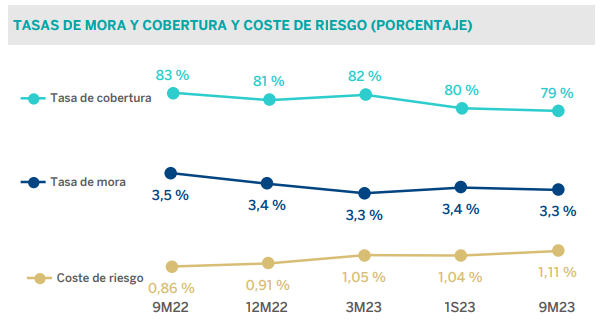 Una de las claves en la que siempre nos fijamos es su tasa de morosidad, que determina en cierta manera la calidad de la cartera de préstamos del banco. En el caso de BBVA, está influenciada por sus negocios internacionales, por lo que es normal que difiera de entidades que solo tienen negocio en España o que es su principal mercado. En este caso, es del 3,3%.