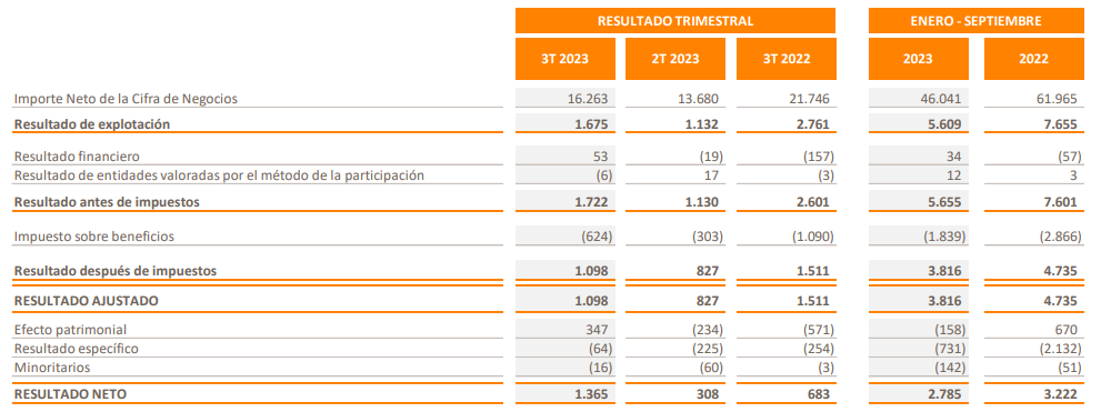 La compañía ha sufrido una caída de ingresos del -25% con respecto al mismo trimestre del año anterior y un -25,7% en los nueve primeros meses del año. Además, el resultado ajustado también se ha reducido hasta alcanzar una caída del -27,3% en el tercer trimestre de este año frente al tercer trimestre del 2022. La cifra que sí que crece es el beneficio neto, que ha doblado la cifra conseguida en el 3T 2022, pero sigue cayendo en lo que va de año un -13,56%.