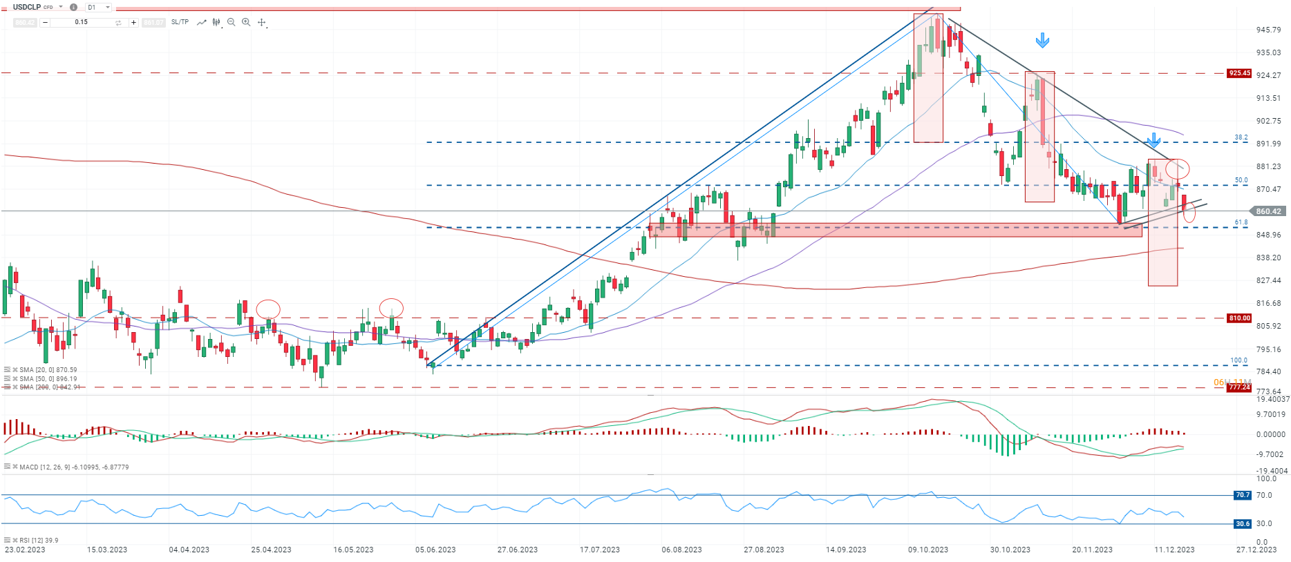 El par de divisas USDCLP exhibe actualmente una figura de triángulo simétrico, en la que ha mantenido el respeto de ambas directrices. Al analizar más detenidamente, se puede observar que el par se encuentra en una zona crítica, correspondiente al nivel de soporte del retroceso de Fibonacci, específicamente en el nivel del 61.8%. Fuente: xStation 5