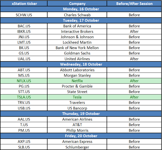 Cinco miembros del Dow Jones informarán esta semana: Johnson & Johnson (JNJ.US), Goldman Sachs (GS.US), Procter & Gamble (PG.US), Travelers (TRV.US) y American Express (AXP.US). representa alrededor del 18% del peso del índice. Además de eso, a los inversores se les ofrecerán informes de otras empresas tan conocidas como Tesla (TSLA.US) o Netflix (NFLX.US).