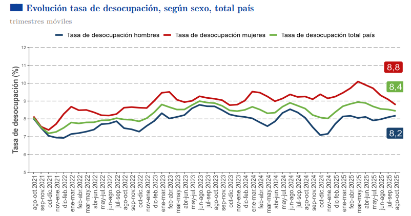 El desempleo femenino descendió a 8,8%, mientras el masculino subió levemente a 8,2%, evidenciando diferencias persistentes en el mercado laboral.