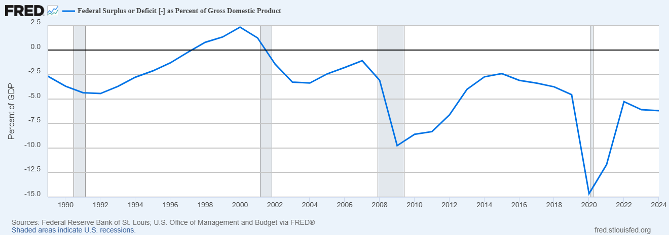 Superávit o déficit federal [-] como porcentaje del producto interno bruto. Fuente: U.S. Department of the Treasury. Fiscal Service.
