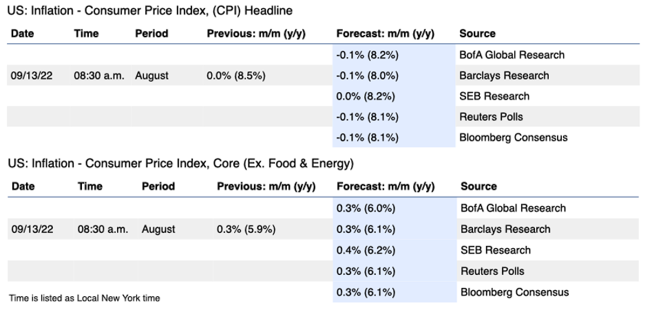 Las principales instituciones financieras de EE. UU. suponen que la inflación general caerá al 8,1% a/a. Las perspectivas para la inflación, excluidos los precios de la energía y los alimentos, son ligeramente diferentes. En este caso, el consenso es que la inflación suba a alrededor de 6,1% a/a. Fuente: eFXdata
