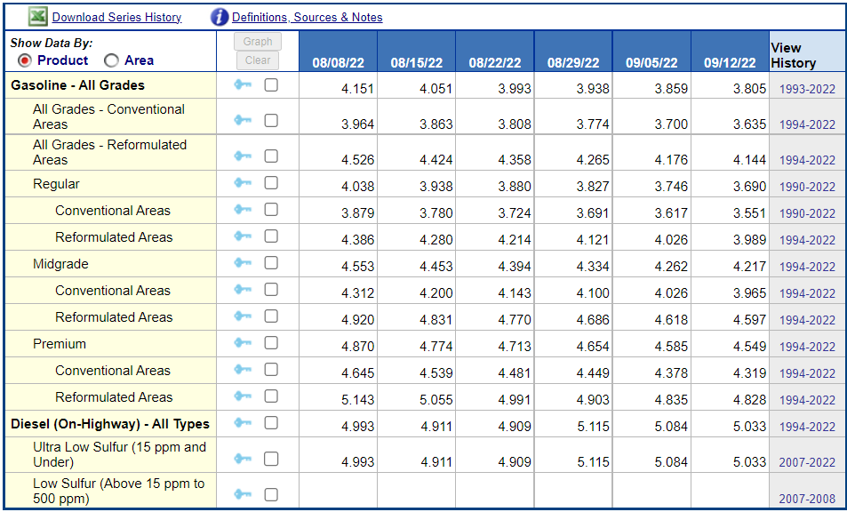 Los precios minoristas de la gasolina y el diésel en EE. UU. han disminuido considerablemente hasta agosto de 2022. Curiosamente, las reducciones graduales en los precios del combustible han continuado durante 13 semanas seguidas y ya han caído un 26 % desde el punto máximo. Fuente: EIA