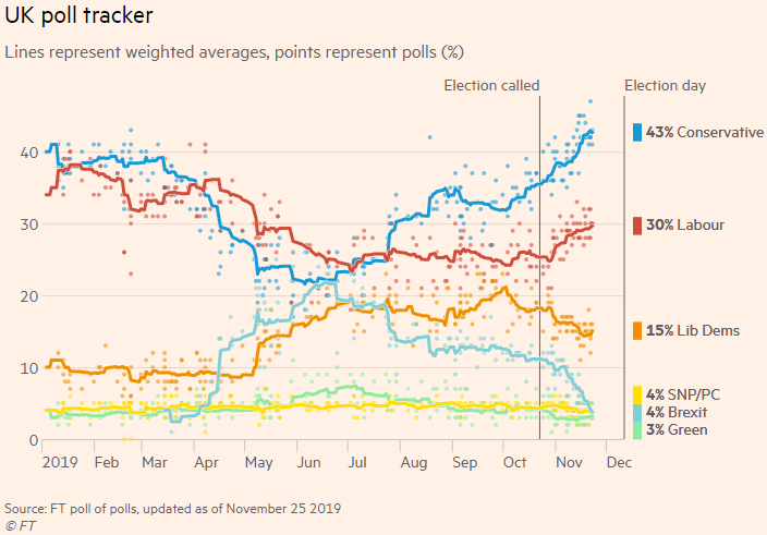 Según las encuestas de opinión, ha habido un aumento en el apoyo popular para los dos partidos principales desde que se convocaron las elecciones, pero lo más importante es que la brecha entre los conservadores y los laboristas se ha mantenido bastante estable en torno al 10-15%. Fuente: Encuesta FT