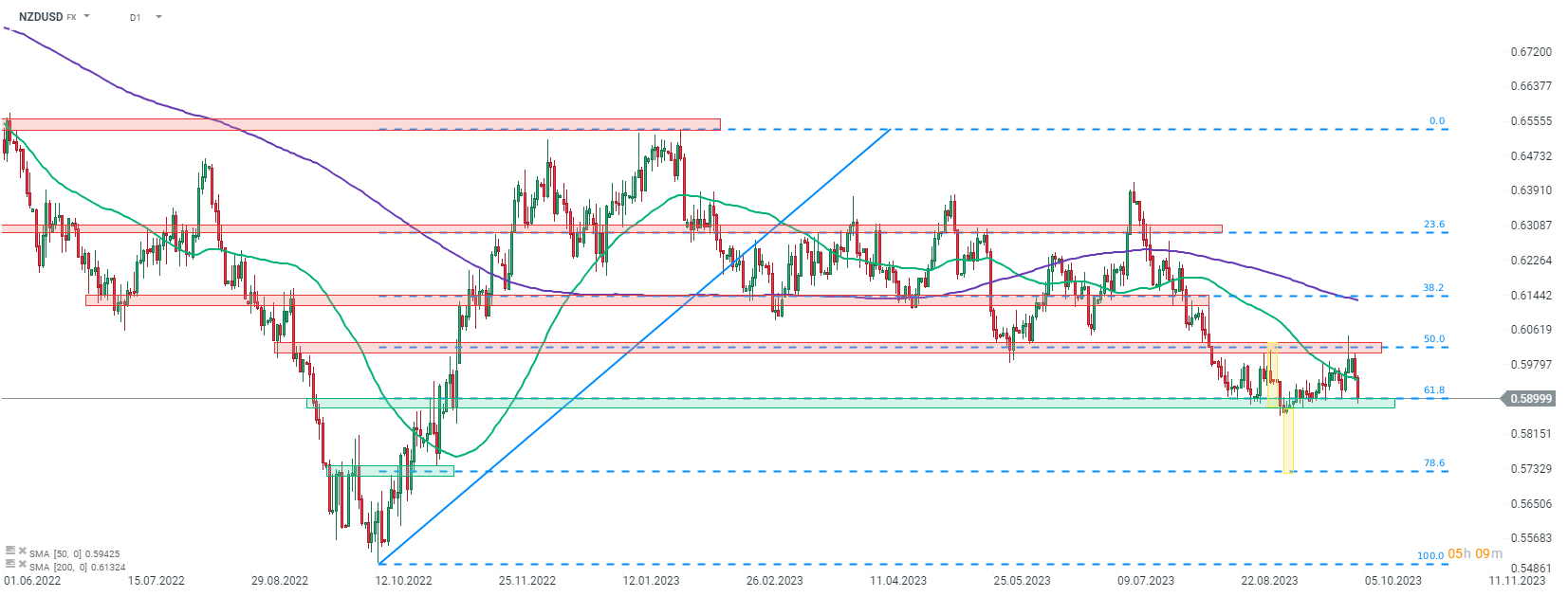 Si observamos el gráfico del NZD/USD en el intervalo D1, podemos ver que el par intentó recientemente superar la zona de resistencia marcada con un retroceso del 50% del movimiento alcista iniciado en octubre de 2022, pero fracasó. Un fuerte retroceso esta semana empujó al par hacia la zona de soporte marcada con un retroceso del 61,8% que actúa como el límite inferior del rango de negociación reciente.