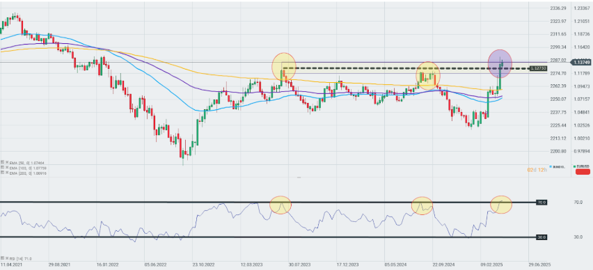 El par EUR/USD ha alcanzado sus niveles más altos desde febrero de 2022. Al observar el gráfico W1 y el indicador RSI, podemos ver que el reciente repunte impulsó al par por encima de la zona de los 70 puntos, un nivel que históricamente suele limitar futuros movimientos alcistas fuertes.