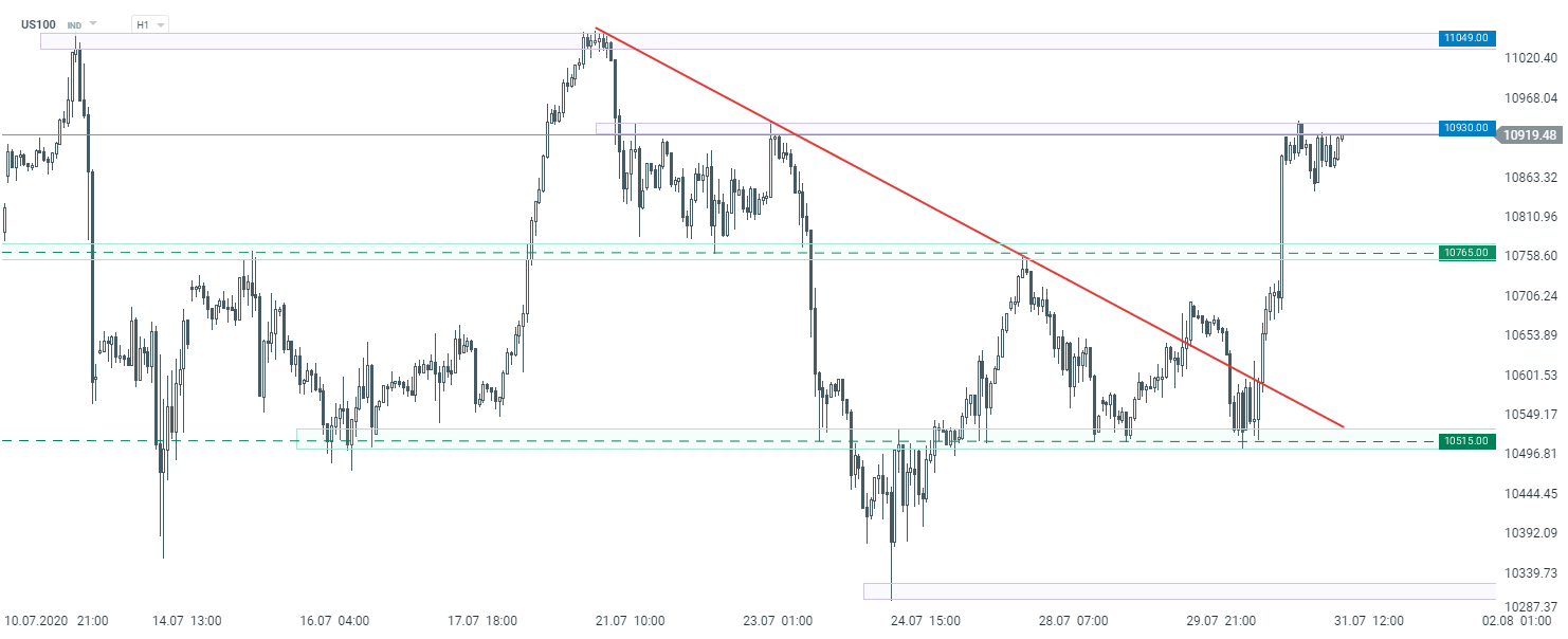 Nasdaq (US100) se recuperó ayer después del cierre de sesión, ya que los resultados de las compañías de Big Tech resultaron ser mejores de lo esperado y, en muchos casos, mejores que hace un año. El índice está probando la resistencia a 10,930 pts en el momento de la publicación. Sin embargo, la reciente acción del precio insinúa que se avecina un ataque a 11.050 pts. Fuente: xStation5