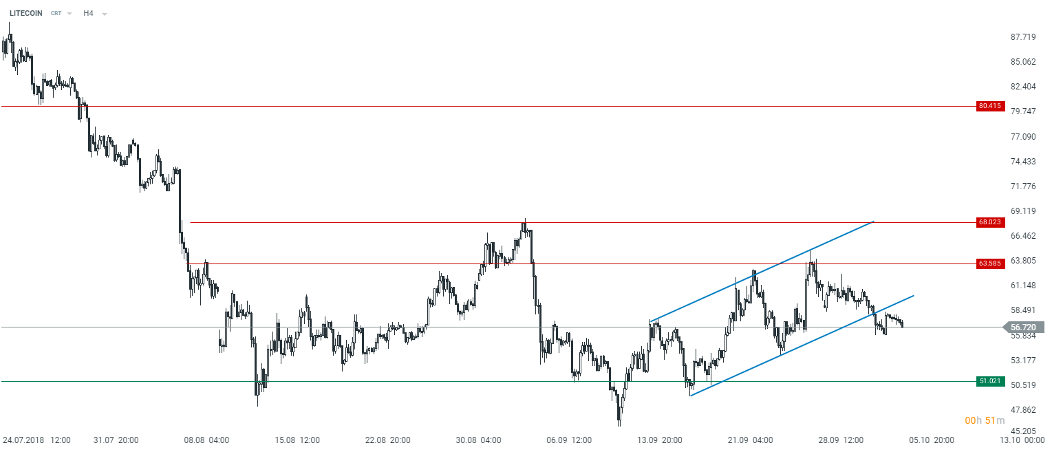A diferencia de Ethereum, el precio de Litecoin ha estado cayendo en las últimas horas. Como resultado, el precio se movió a través del límite inferior del canal ascendente. Por lo tanto, parece razonable esperar que el precio continúe moviéndose hacia abajo, incluso hacia los 51 $, donde podría localizarse el primer soporte más notable. ¿Qué tendría que pasar para cambiar esta dirección? Parece que el precio tendría que volver al canal de nuevo y luego intentar superar los 63 $. Dicho esto, parece el escenario menos probable por el momento. Note que los alcistas ya intentaron hacerlo pero fallaron y luego los vendedores comenzaron a prevalecer nuevamente. Fuente: xStation5