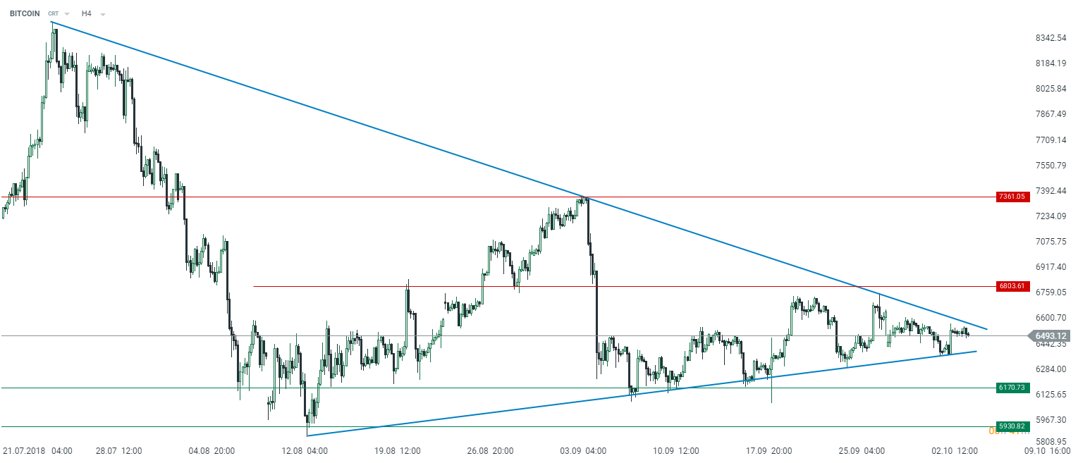 Por último, pero no menos importante, la perspectiva técnica de Bitcoin se parece al Ethereum ya que ambas criptomonedas están llegando al final de sus patrones de triángulos. En el caso de los primeros ya hemos escrito varias veces sobre esta formación de líneas. ¿Qué esperar a continuación? Uno puede detectar que el espacio para un posible aumento o disminución (dependiendo de dónde se mueva el precio después de dejar el triángulo) parece ser similar: la primera resistencia y el soporte se colocan en los 6800 $ y los 6170 $ respectivamente. Sin embargo, si el Bitcoin se mueve a través de los 6800 $ con éxito, podría abrir el camino para un movimiento adicional de hasta los 7360 $. Este no es el caso si el precio se rompe por debajo del límite inferior del canal, ya que el posible movimiento descendente parece estar limitado a los 5930$ . Fuente: xStation5