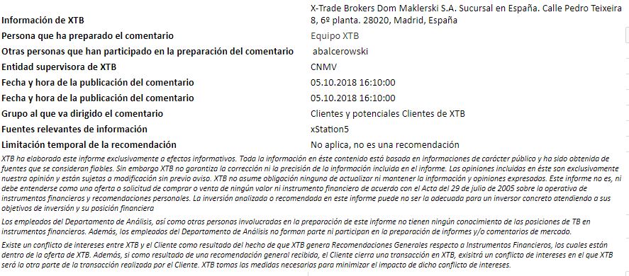 "Este informe se proporciona sólo con fines de información general y con fines educativos. Cualquier opinión, análisis, precio u otro contenido no constituyen asesoramiento de inversión o recomendación en entendimiento de la ley de Belice. El rendimiento en el pasado no indica necesariamente los resultados futuros, y cualquier persona que actúe sobre esta información lo hace bajo su propio riesgo. XTB no aceptará responsabilidad por ninguna pérdida o daño, incluida, sin limitación, cualquier pérdida de beneficio, que pueda surgir directa o indirectamente del uso o la confianza de dicha información. Los contratos por diferencias (""CFDs"") son productos con apalancamiento y acarrean un alto nivel de riesgo. Asegúrese de comprender los riesgos asociados. "