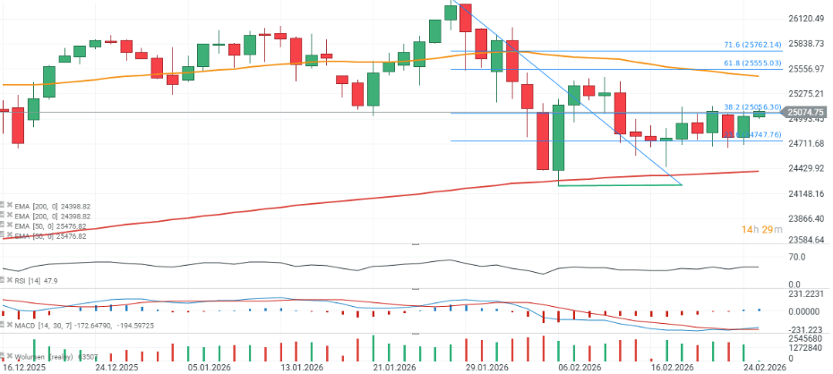 - En general, los niveles de soporte clave siguen siendo 24.750 (retroceso de Fibonacci del 23,6%; también reforzado por reacciones recientes del precio—mechas inferiores en las últimas nueve velas) y 24.400 (EMA200). La resistencia clave sigue siendo 25.500, donde el retroceso del 61,8% se alinea con la EMA50 (línea naranja).