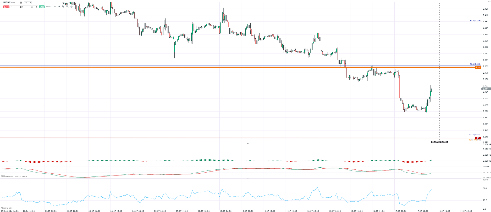 El gráfico de NATGAS muestra una recuperación reciente en las últimas velas, sin embargo, el precio aún se encuentra dentro de un rango bajista predominante. A pesar del repunte, el nivel de resistencia clave en 2.201 aún no ha sido superado, lo que sugiere que la tendencia bajista podría continuar si no se rompe este nivel.
