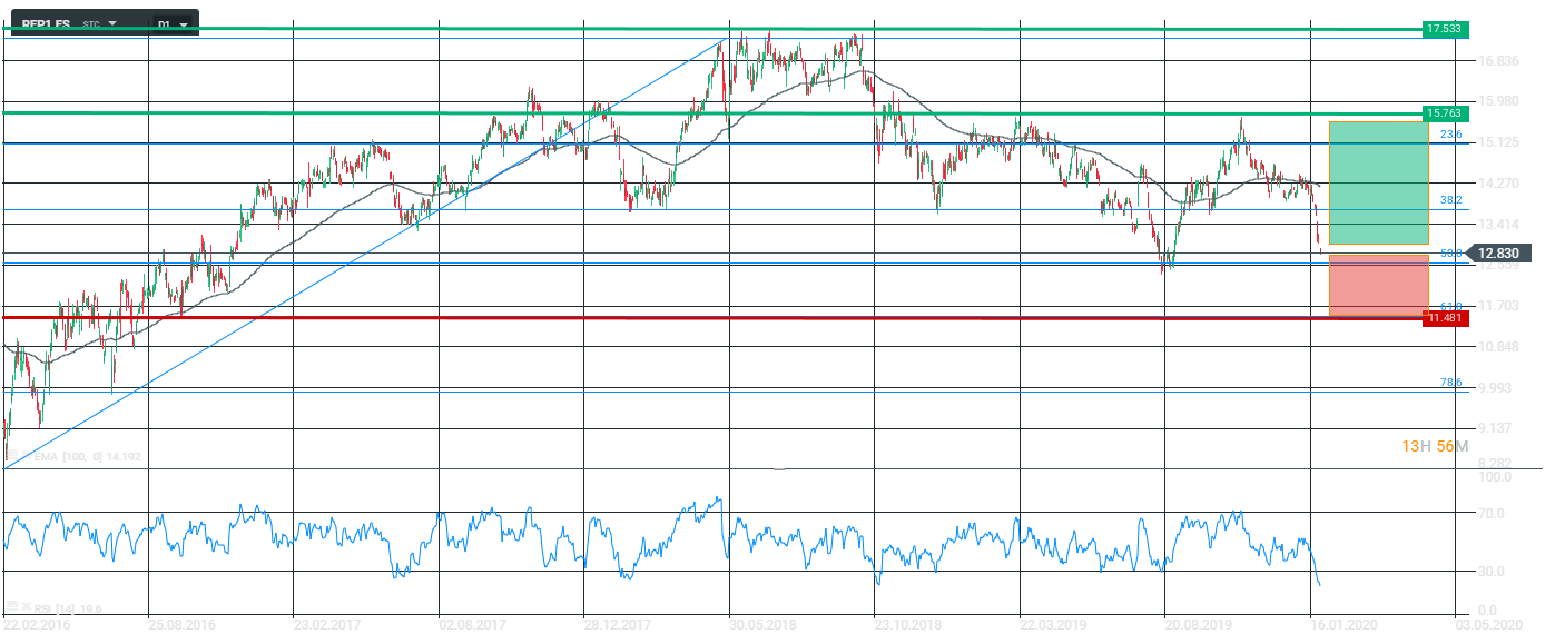 Desde un punto de vista técnico, el RSI ha entrado en una zona de sobreventa por debajo del nivel 30. Si el valor es capaz de soportar el nivel 50 del retroceso de Fibonacci sería interesante tomar posiciones compradoras. Para nuestra operación de trading planteamos dos objetivos, el primero sería recuperar las resistencias de los 15,7 euros y de superarlas la segunda cota a recuperar sería los máximos de 2018 de los 17,5 euros.