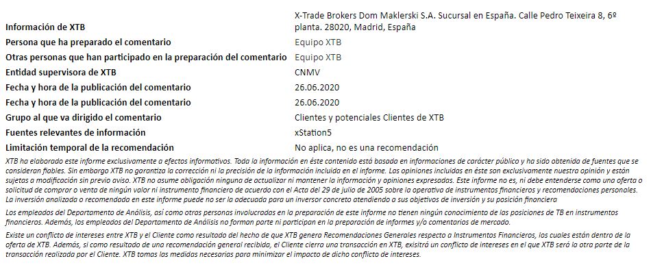 "Este informe se proporciona sólo con fines de información general y con fines educativos. Cualquier opinión, análisis, precio u otro contenido no constituyen asesoramiento de inversión o recomendación en entendimiento de la ley de Belice. El rendimiento en el pasado no indica necesariamente los resultados futuros, y cualquier persona que actúe sobre esta información lo hace bajo su propio riesgo. XTB no aceptará responsabilidad por ninguna pérdida o daño, incluida, sin limitación, cualquier pérdida de beneficio, que pueda surgir directa o indirectamente del uso o la confianza de dicha información. Los contratos por diferencias (""CFDs"") son productos con apalancamiento y acarrean un alto nivel de riesgo. Asegúrese de comprender los riesgos asociados. "