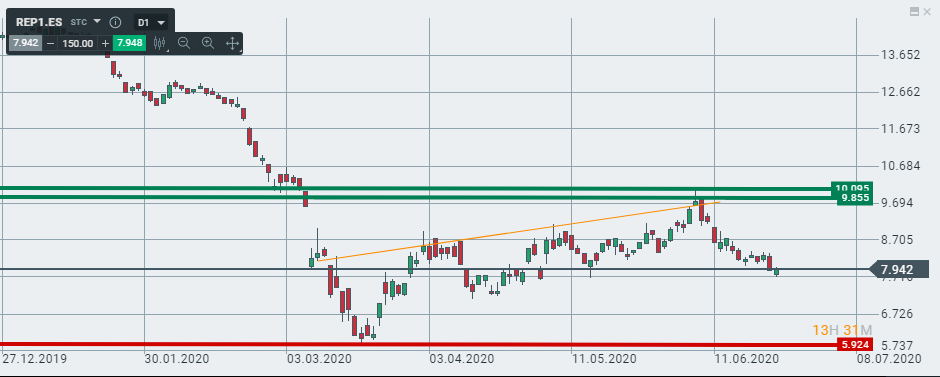 quedan pasos por dar en el proceso de reestructuración financiera de la compañía en el medio plazo. En el plano técnico, tras alcanzar su último máximo ligeramente por encima de los 10 EUR/acción el pasado 8 de junio, Repsol observó una notable corrección en el precio (casi un 20%) que la ha hecho retornar a la frontera de los 8 EUR/acción, zona de soporte más cercana en la actualidad. Tras detectarse un hueco a la baja en su cotización, así como un cruce de medias móviles que sitúa a la de 200 sesiones (naranja) sobre la de 50 (amarilla), parece establecerse una evolución más ligada al soporte anteriormente mencionado que en dirección al último máximo.