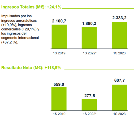 El gestor aeroportuario está aprovechando el repunte en el turismo para consolidar su recuperación, el tráfico de pasajeros creció hasta los 144 millones, un 22,8% más que en 2022, lo que supone un 100,05% respecto a 2019. Esto se ha traducido en un incremento del 24% en sus ingresos hasta los 2.307 millones de euros y del 119% en sus beneficios hasta los 607 millones.