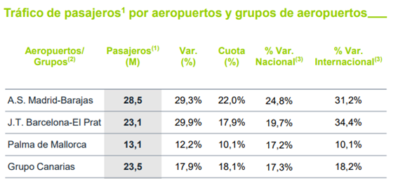 El aumento de pasajeros se ha producido en todos los aeropuertos y en todos los tipos de tráfico. En España la subida ha sido del 20,9%, mientras que, a nivel internacional, el incremento ha sido del 24,7%. Madrid, Barcelona, Palma de Mallorca y Canarias continúan siendo los destinos con mayor tráfico a nivel nacional y todos ellos han crecido a doble dígito, destacando la mejora de Madrid y Barcelona, que ha sido cercana al 30%.