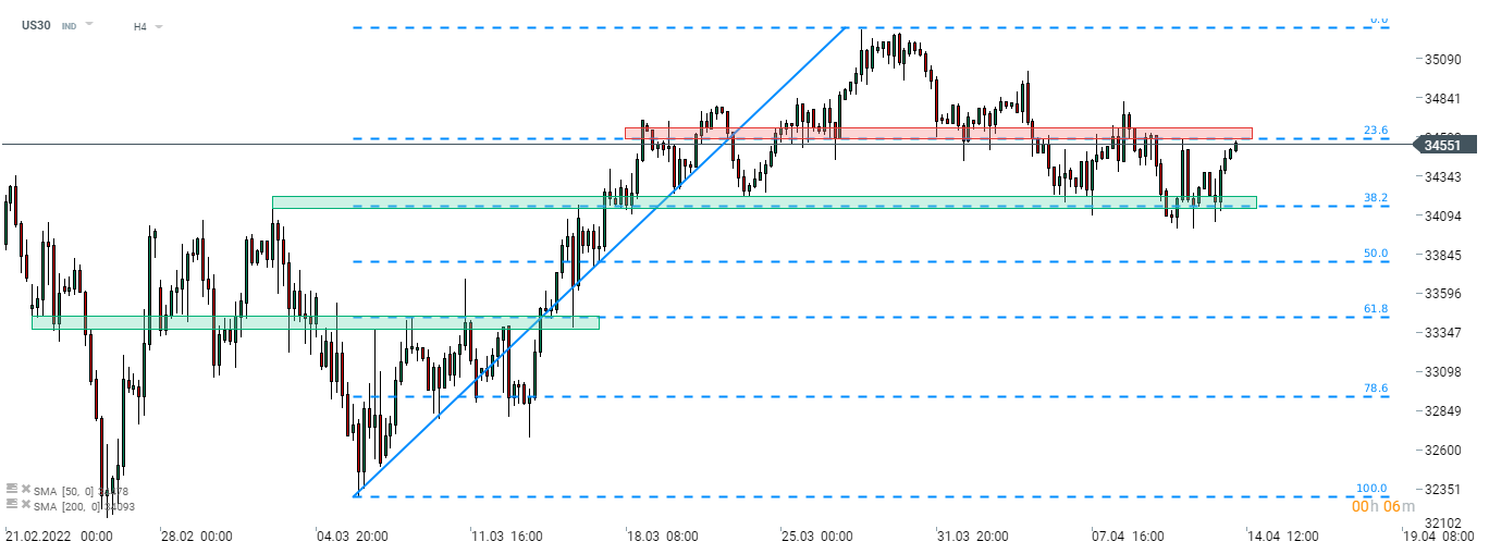 Los índices estadounidenses lograron romper una racha perdedora. Dow Jones (US30) encontró soporte en un retroceso del 38,2% del movimiento alcista lanzado a principios de marzo y comenzó a recuperarse. El índice actualmente está probando una zona de resistencia marcada con un retroceso de 23.6% en el área de 34,600 pts. Fuente: xStation5