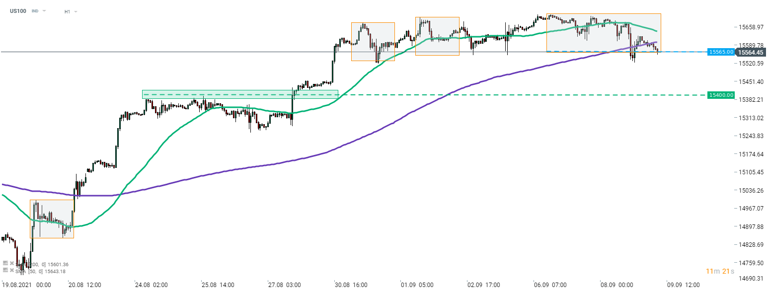 Si bien US100 ha sido más resistente que otros índices de Wall Street recientemente, comenzó a moverse a la baja esta semana. El índice tecnológico estadounidense retrocedió desde máximos históricos y está probando el límite inferior de la geometría del mercado local en 15,565 pts. El siguiente apoyo a observar se puede encontrar en el área de swing de 15,400 pts. Fuente: xStation5