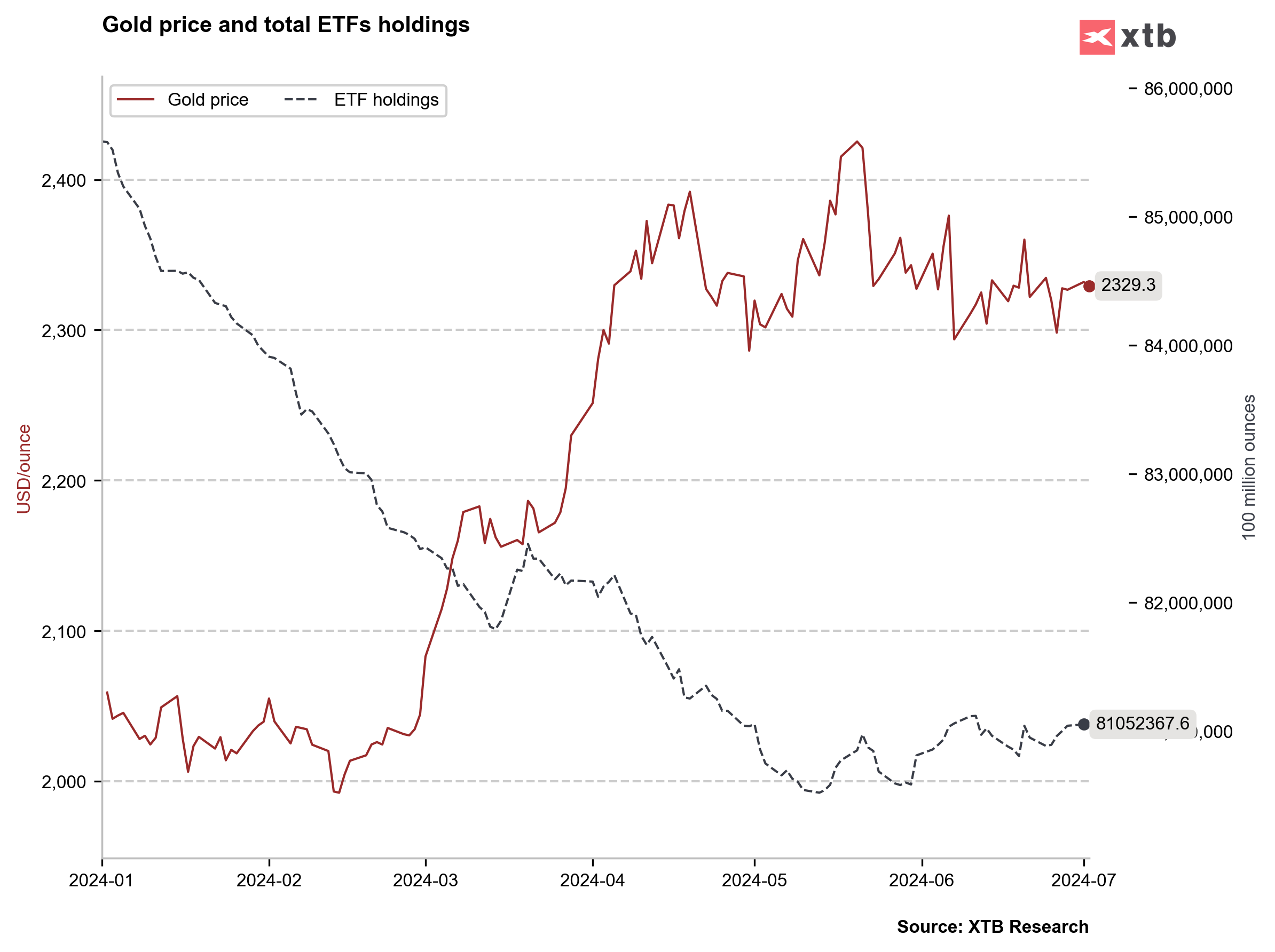 Los ETF no han estado vendiendo oro desde hace bastante tiempo, lo que podría significar posicionarse para los próximos cambios fundamentales en el mercado. Fuente: Bloomberg Finance LP, XTB