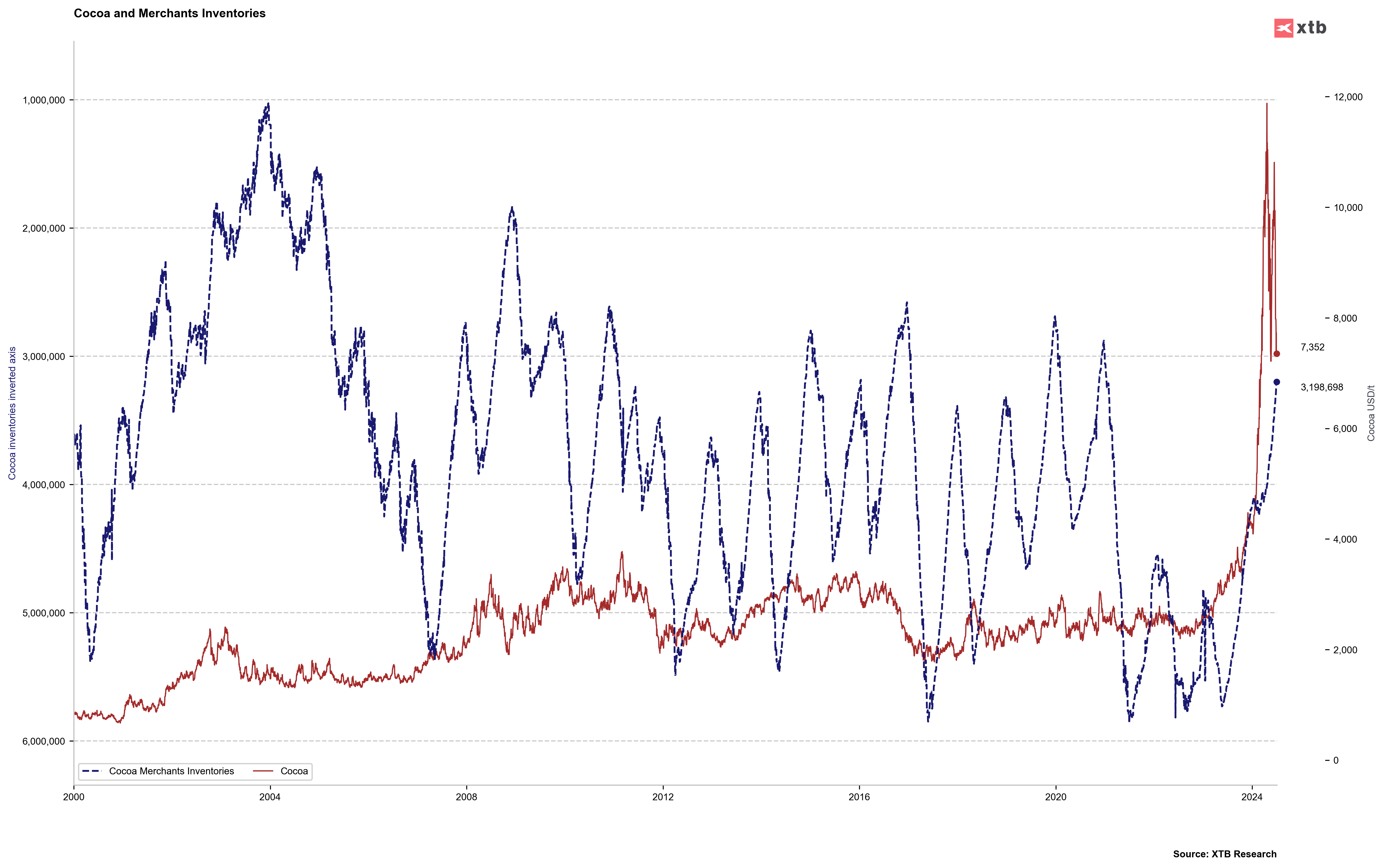 Los inventarios de cacao continúan con fuertes caídas. Sin embargo, si las existencias alcanzan un mínimo local, podría significar el fin de los aumentos a largo plazo del cacao. Fuente: Bloomberg Finance LP, XTB