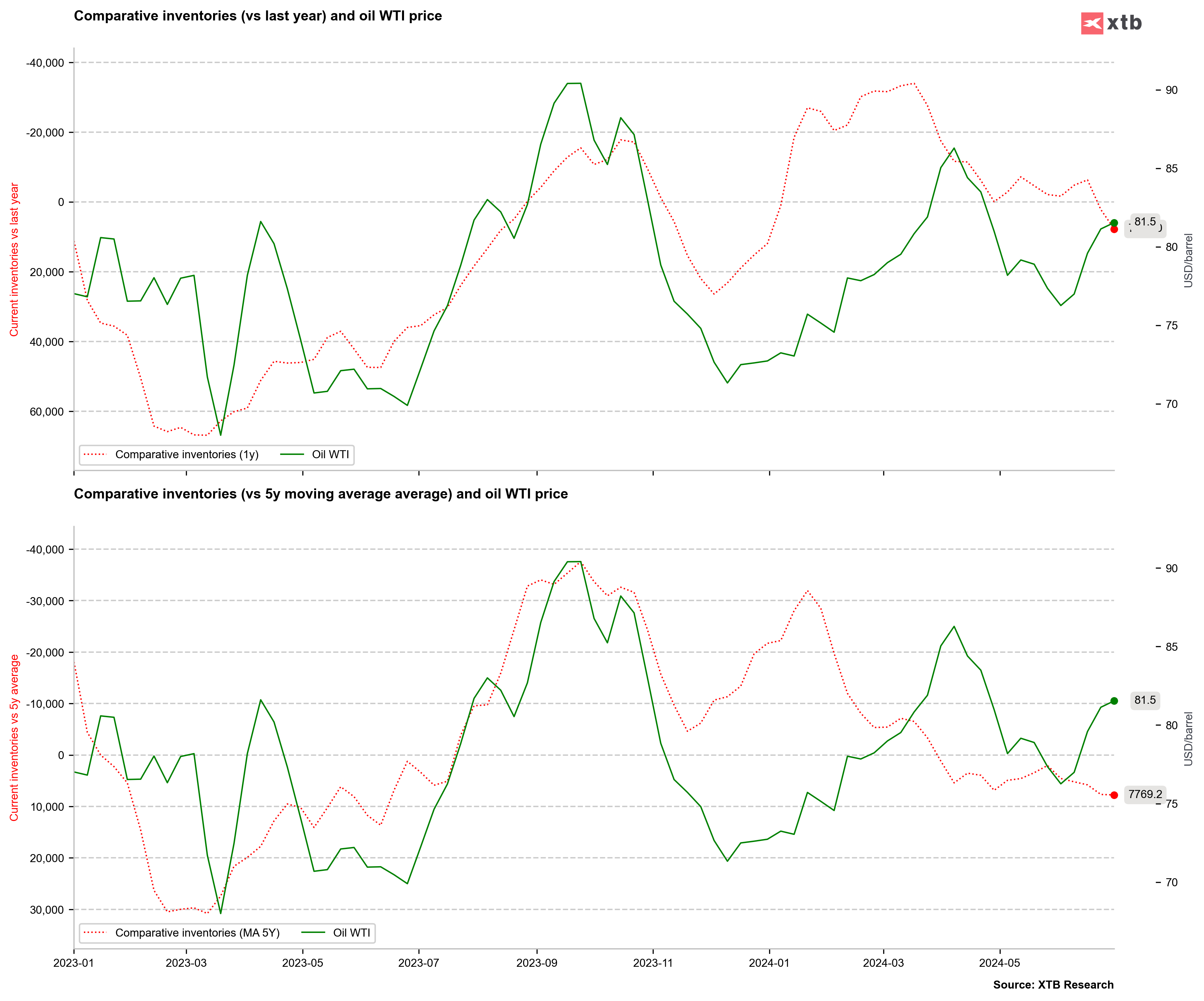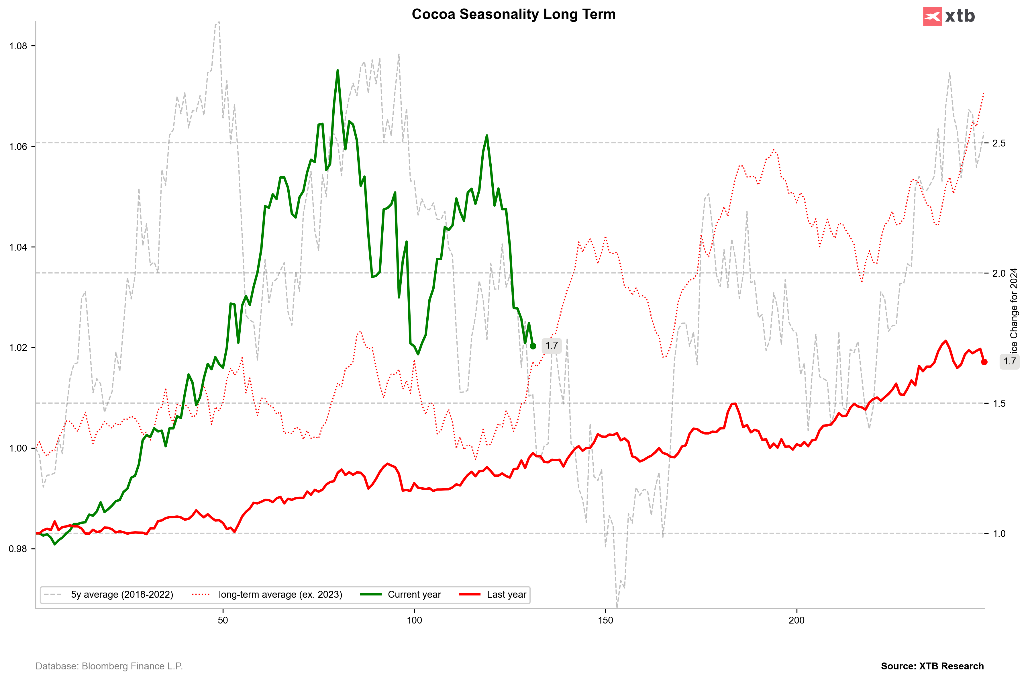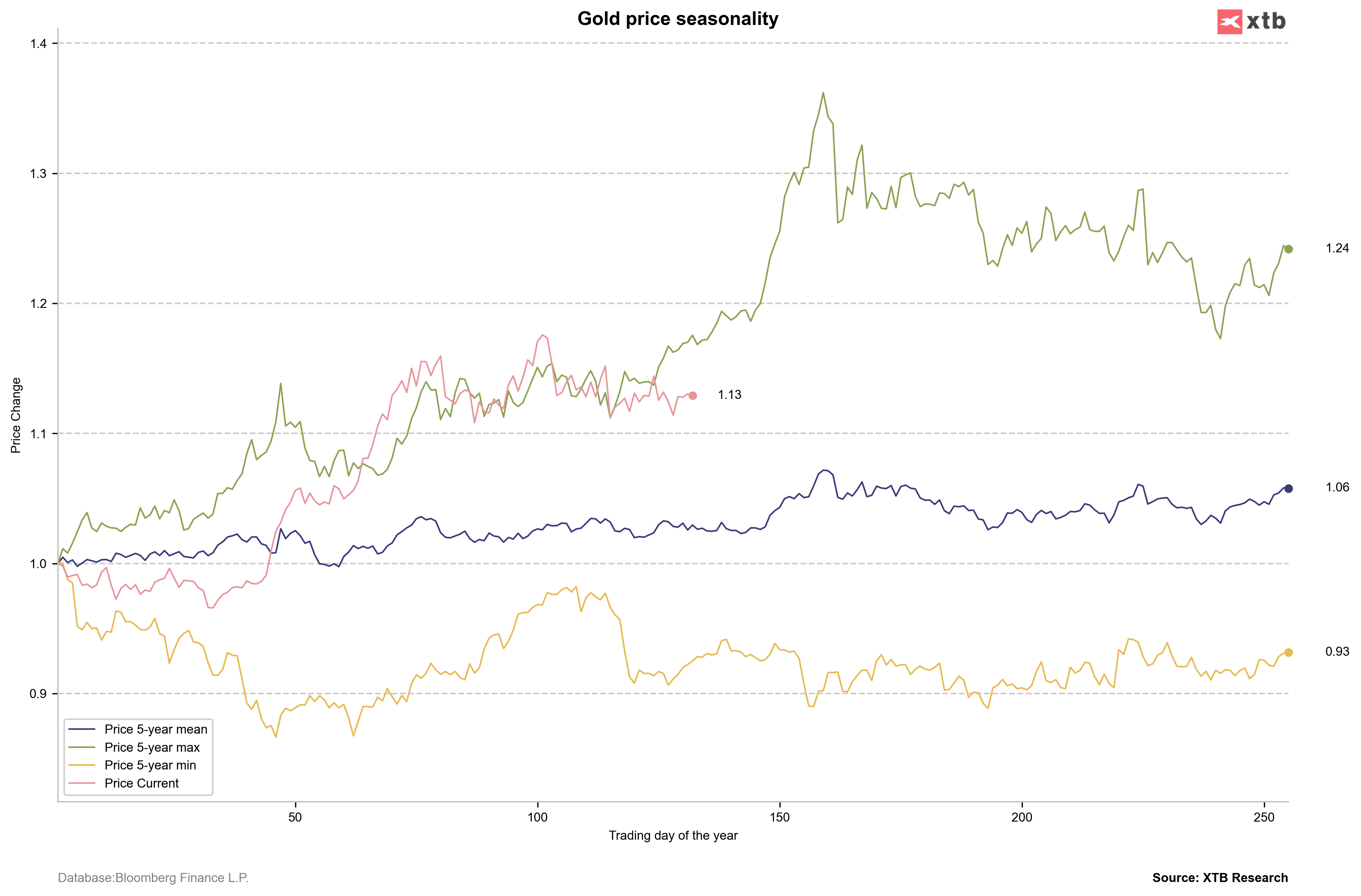 La estacionalidad indica que podemos esperar una recuperación a finales de julio. Potencialmente, esto podría estar relacionado con la especulación sobre los recortes de tipos en Estados Unidos. Fuente: Bloomberg Finance LP, XTB