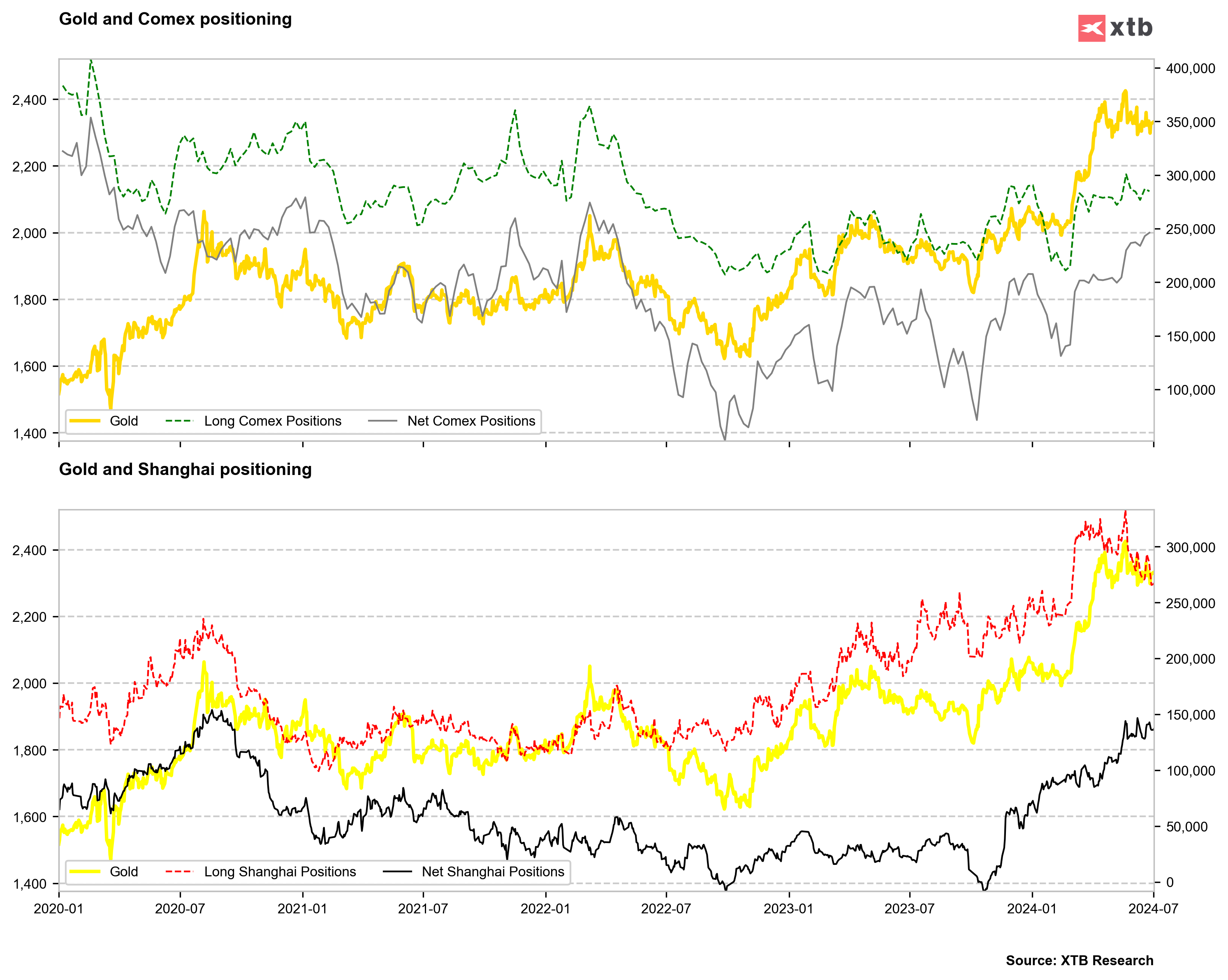 Al mismo tiempo, sin embargo, es evidente que el entusiasmo de los inversores chinos por el oro se está desvaneciendo, lo que también puede estar relacionado con un dólar demasiado fuerte. Mientras tanto, el número de posiciones largas en oro en la Bolsa de Valores de Shanghai está cayendo. Fuente: Bloomberg Finance LP, XTB
