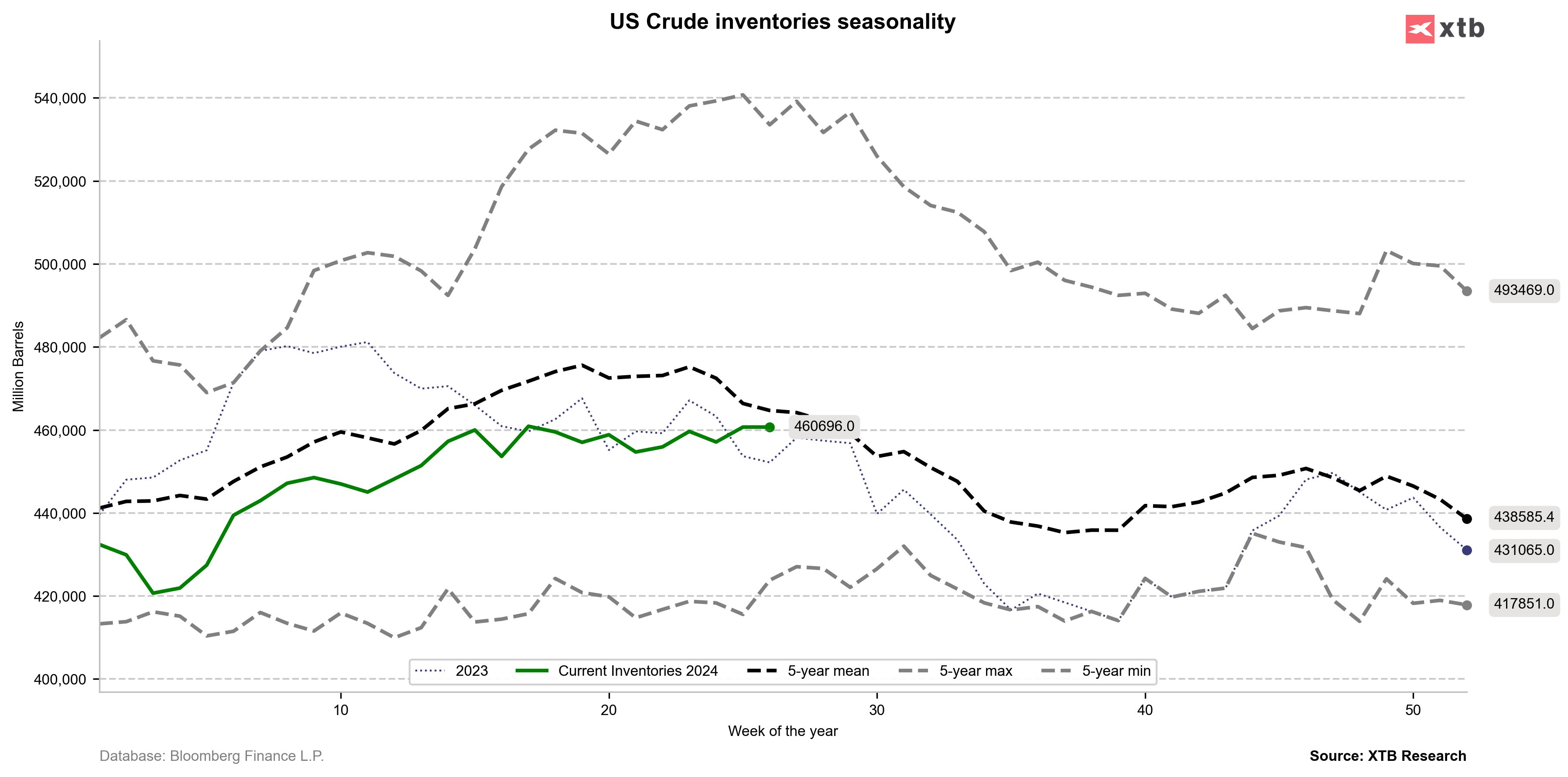 Los inventarios de petróleo están aumentando, aunque la estacionalidad sugiere que ya deberían estar cayendo. El período clave de caída es julio-agosto. Fuente: Bloomberg Finance LP, XTB