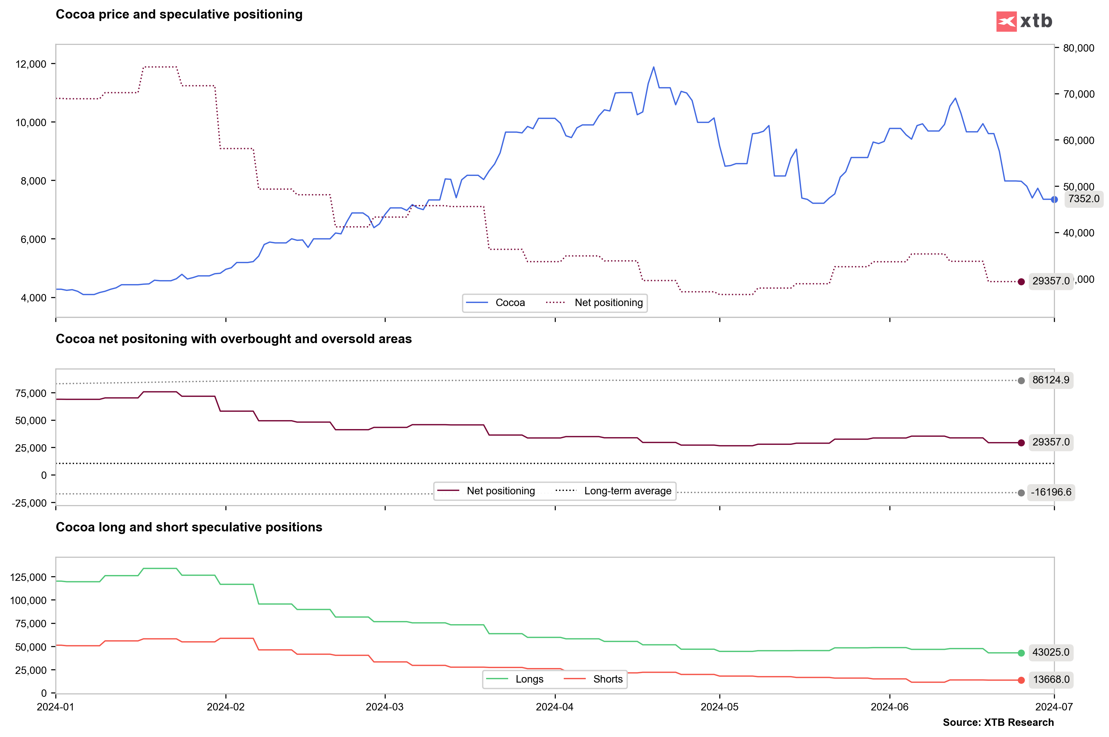 Las posiciones especulativas sobre el cacao (largas y cortas) siguen cayendo, lo que no es una buena señal para la continuación del crecimiento a largo plazo. Fuente: Bloomberg Finance LP, XTB