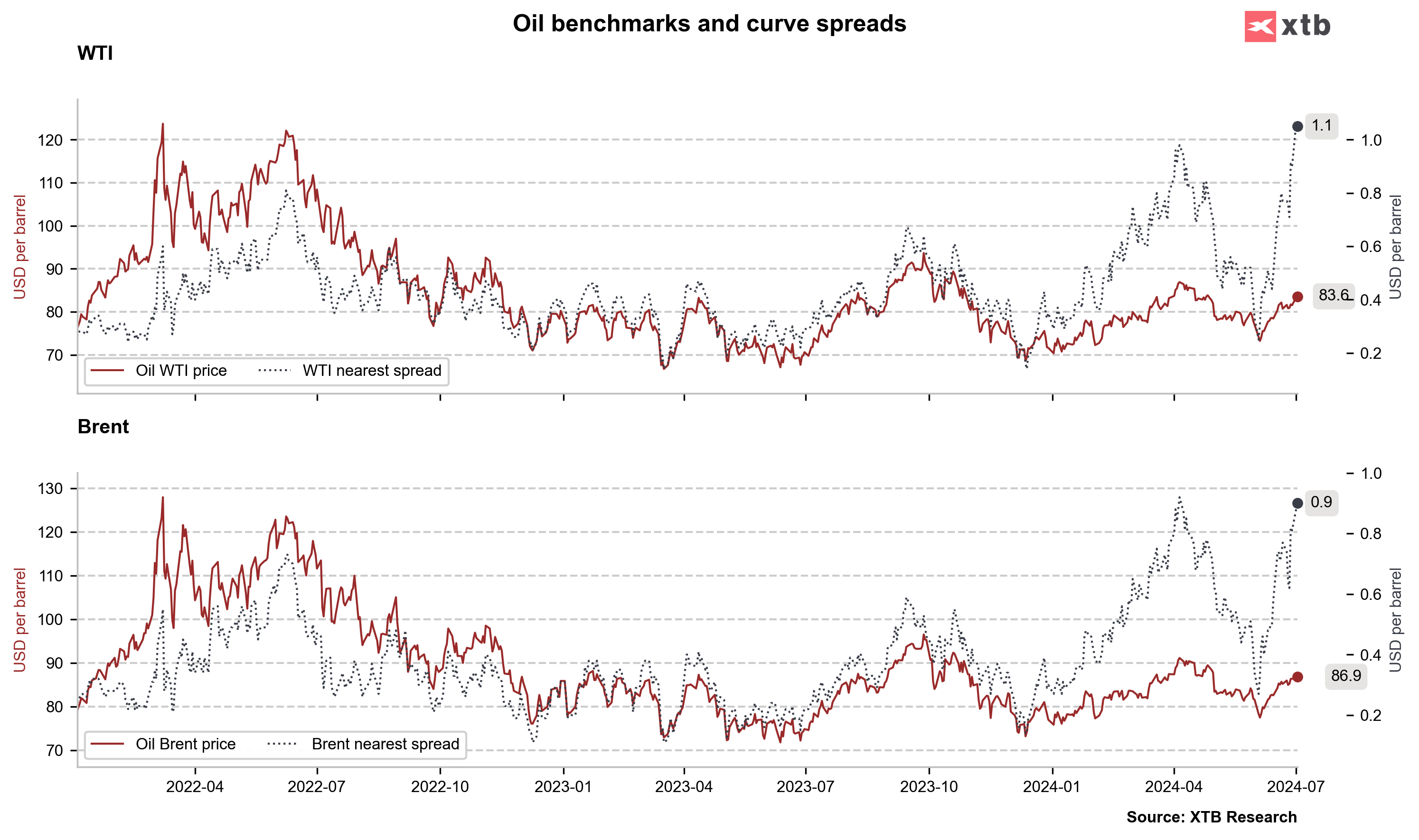 Los diferenciales de los contratos sugieren una posible ligera sobrevaluación o una demanda extremadamente alta de suministros de petróleo a corto plazo. Fuente: Bloomberg Finance LP, XTB
