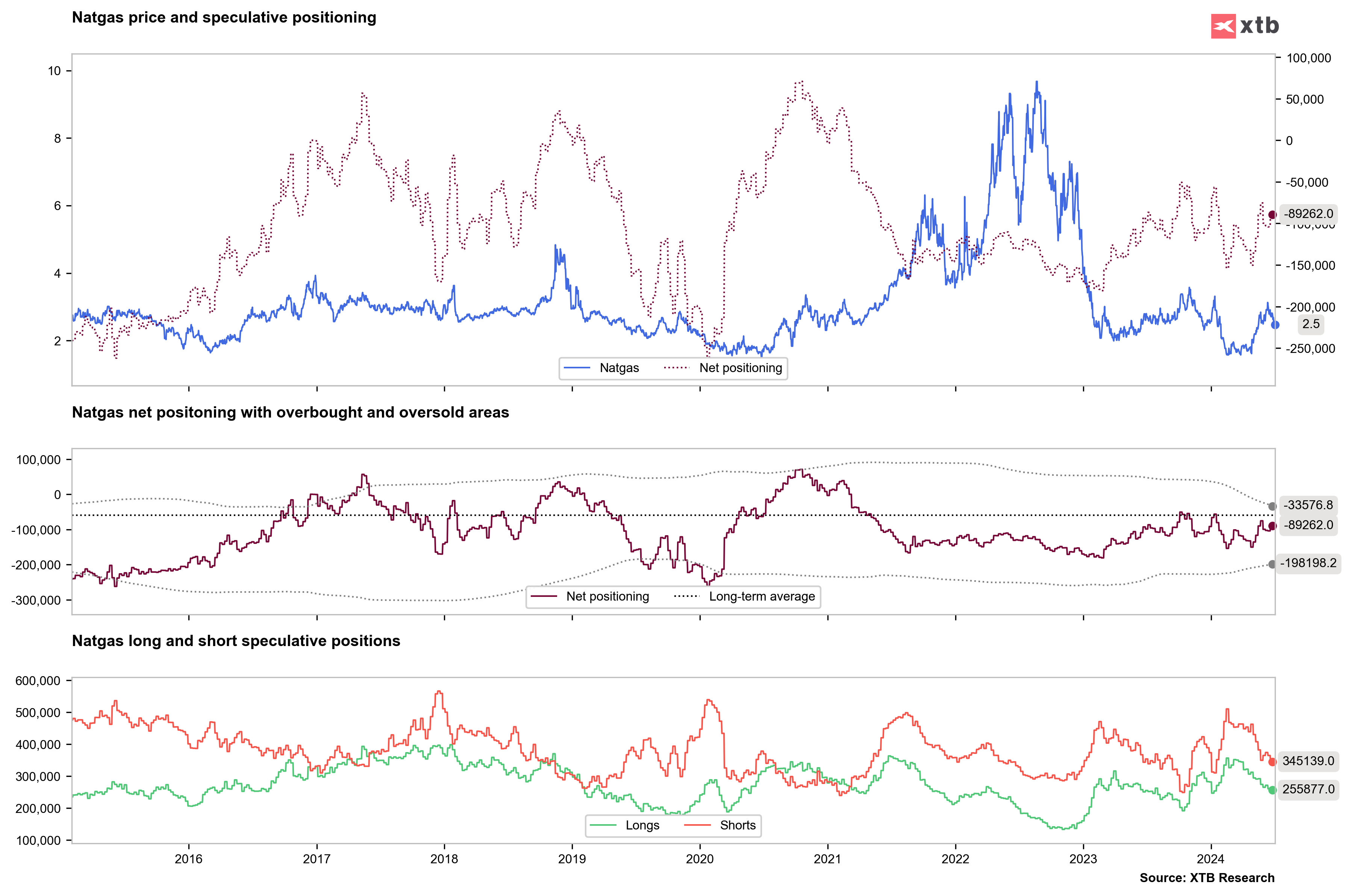Las posiciones largas y cortas están cayendo, aunque las posiciones cortas caen con más fuerza. Ante esto, estamos viendo un repunte de las posiciones netas. Sin embargo, la caída del interés abierto no es positiva para las perspectivas de precios. Fuente: xStation5