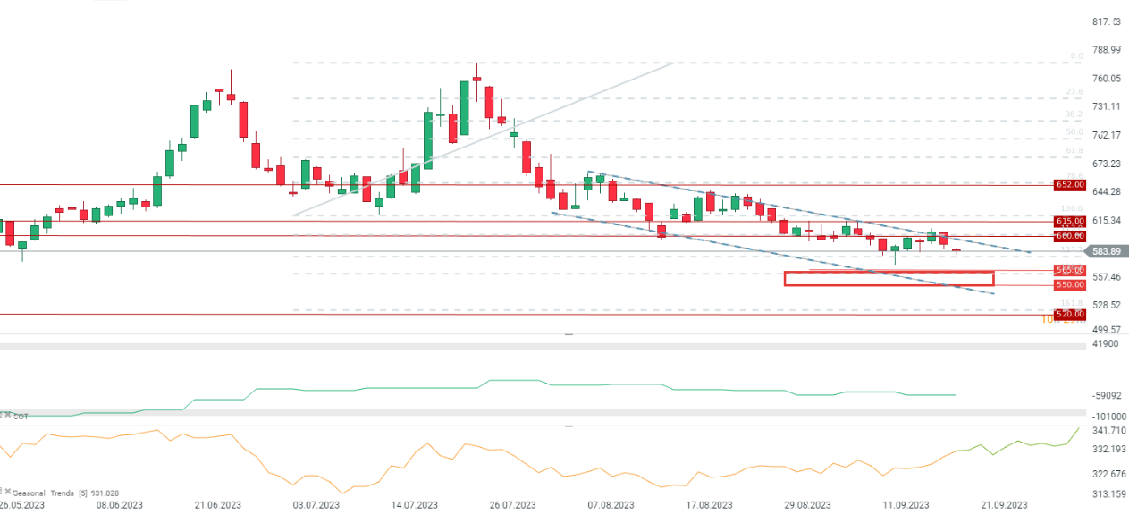 La mayoría de las noticias negativas ya están descontadas sobre el TRIGO, y están empezando a surgir noticias positivas para los precios. No obstante, la reactivación del acuerdo de exportación por vía marítima de Ucrania podría hacer que los precios bajen al rango de 550-565, una zona importante que sirvió de resistencia en 2015-2019. Fuente: xStation5