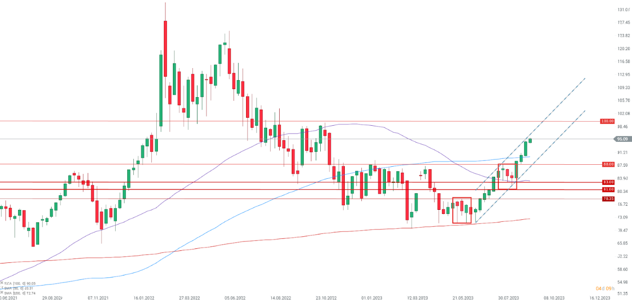 PETRÓLEO El Brent está probando la parte superior del canal alcista en el que se encuentra. El soporte clave se sitúa en 90 dólares por barril, lo que se confirma con el promedio de 100 semanas. Fuente: xStation5