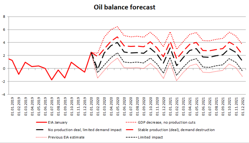 Los escenarios más probables indican un exceso de oferta de 2-4 mbd. Fuente: Bloomberg, EIA, XTB