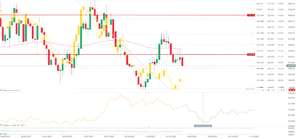 El precio del ORO está cayendo a su nivel más bajo desde finales de agosto. El soporte clave está alrededor de 1.910 $ por onza. La estacionalidad apunta a un mínimo local a mediados de la próxima semana. Fuente: xStation5