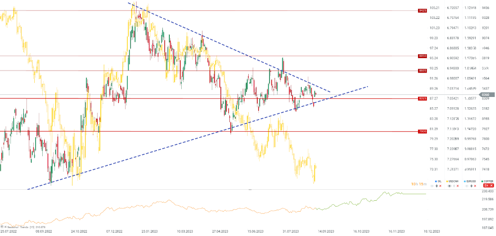 El yuan ha mostrado durante mucho tiempo una enorme debilidad en la economía china. Por otro lado, el cobre se mantiene fuerte. El soporte clave se encuentra cerca de 8.150 $. Un movimiento por debajo de este nivel podría significar una ruptura real de la formación del triángulo. Por otro lado, la estacionalidad apunta a posibles aumentos en la segunda quincena de septiembre, que podrían sostenerse hasta mediados de noviembre. Fuente: xStation5